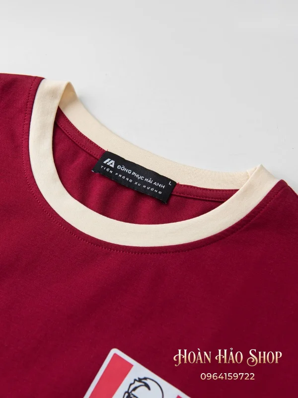 Thiết kế áo cổ tròn với tông màu đỏ đô phối be hài hòa và hiện đại, mang lại hình ảnh chỉn chu và chuyên nghiệp.